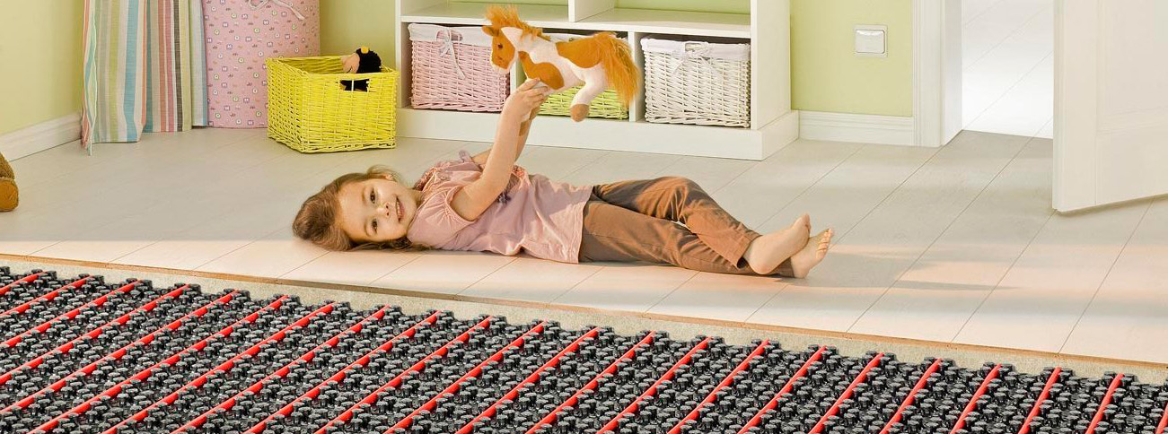 Весь пол становится радиатором. Для отопления достаточно небольшой температуры (+28 °C)./p>