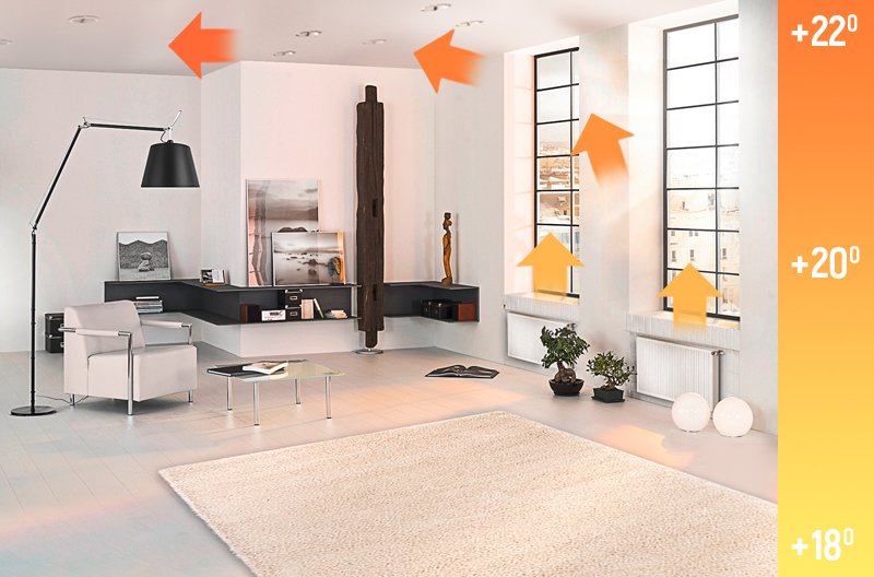Тепло сосредоточено возле радиаторов и под потолком, куда оно сначала поднимается по закону физики, и только потом опускается ниже. Помещение прогревается неравномерно. Пол часто остается холодным.