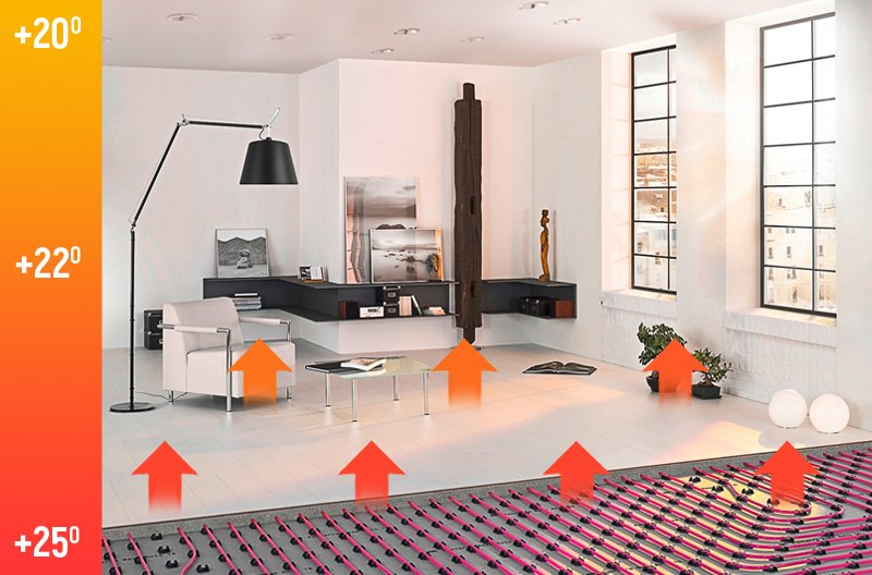 Теплый пол равномерно обогревает весь периметр помещения.Тепловые потоки поднимаются снизу вверх. Наибольшее тепло сосредоточено на уровне роста человека. Нет сквозняков по полу. Ноги всегда в тепле.