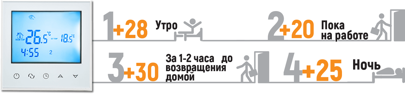 На дисплее отображается время, температура пола и воздуха, выбранный режим работы. Можно запрограммировать работу системы по дням неделям и часам. Включить защиту от детей.